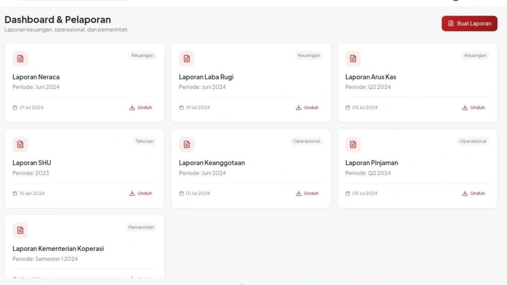 Hasilkan laporan koperasi yang siap digunakan kapan saja. Data tersusun rapi, transparan, dan memudahkan pelaporan ke anggota maupun instansi terkait.