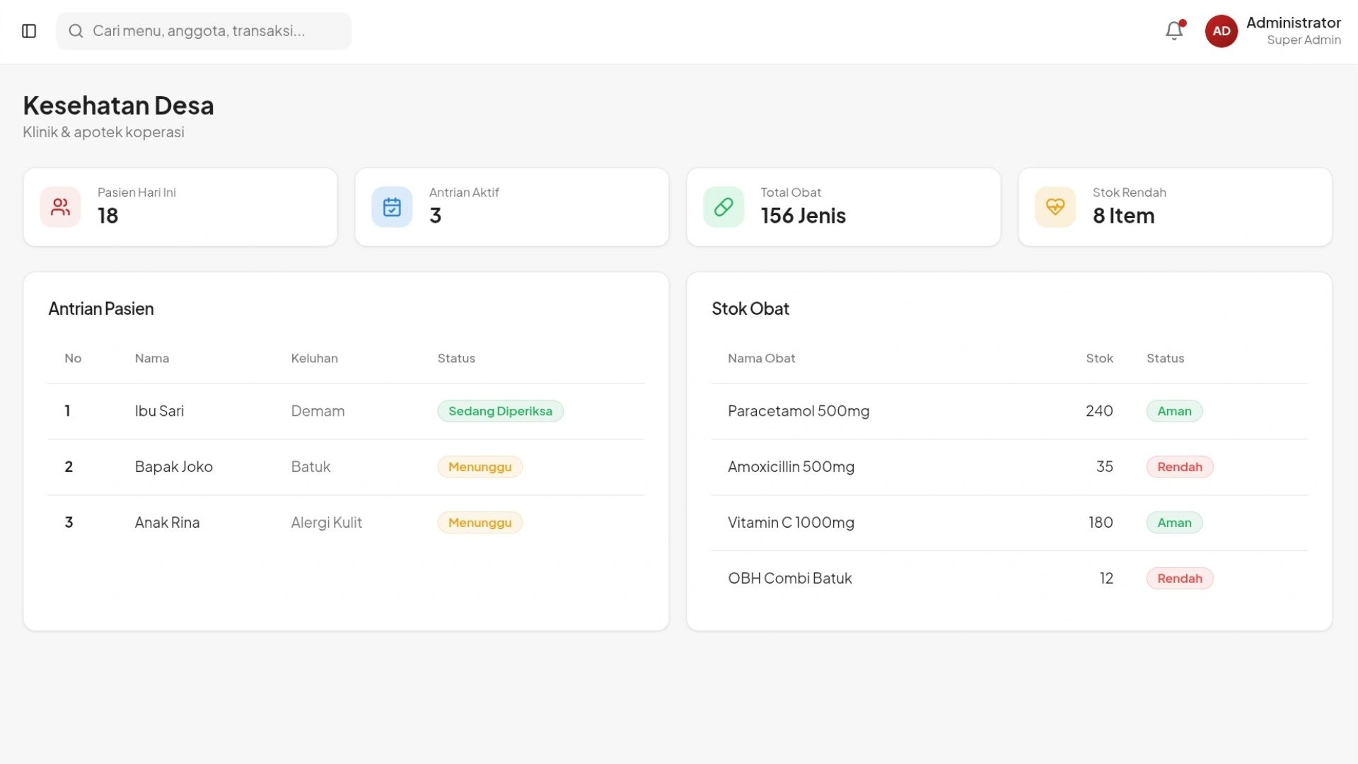 Kelola layanan kesehatan seperti klinik atau apotek desa dalam satu sistem. Mulai dari pencatatan pasien hingga stok obat dapat diatur dengan lebih terorganisir.