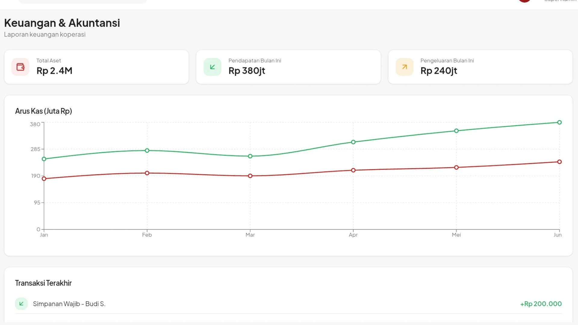 Pantau seluruh aktivitas koperasi dalam satu layar, mulai dari jumlah anggota, simpanan, hingga pinjaman. Data ditampilkan secara langsung sehingga pengurus bisa mengambil keputusan dengan cepat tanpa harus menunggu laporan manual.