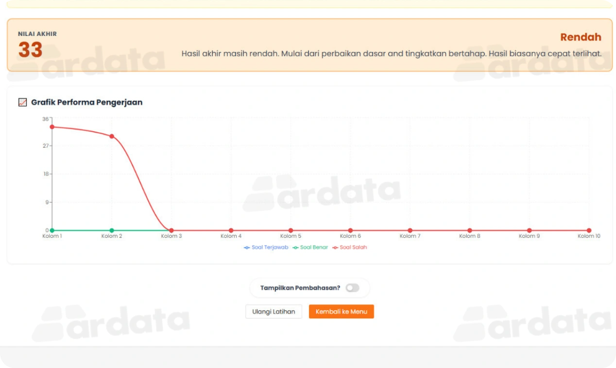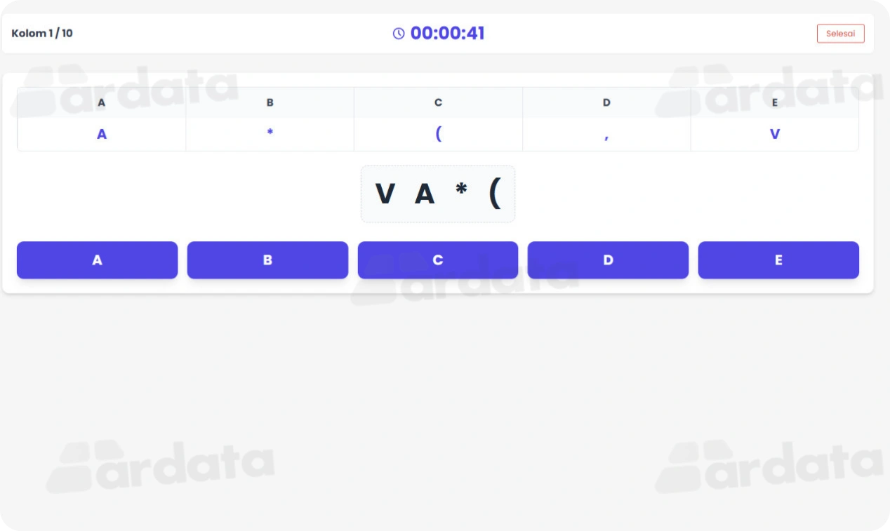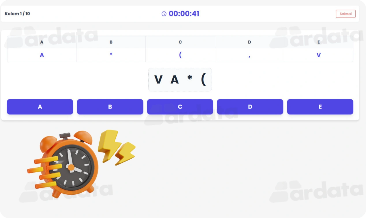 Dengan fitur-fitur unggulan ini, Ardata Media berkomitmen untuk menyediakan solusi terbaik dalam pembuatan sistem tes kecermatan yang andal dan efektif. Sistem kami tidak hanya membantu dalam pelaksanaan tes, tetapi juga meningkatkan kualitas evaluasi pembelajaran di lembaga bimbingan belajar Anda.