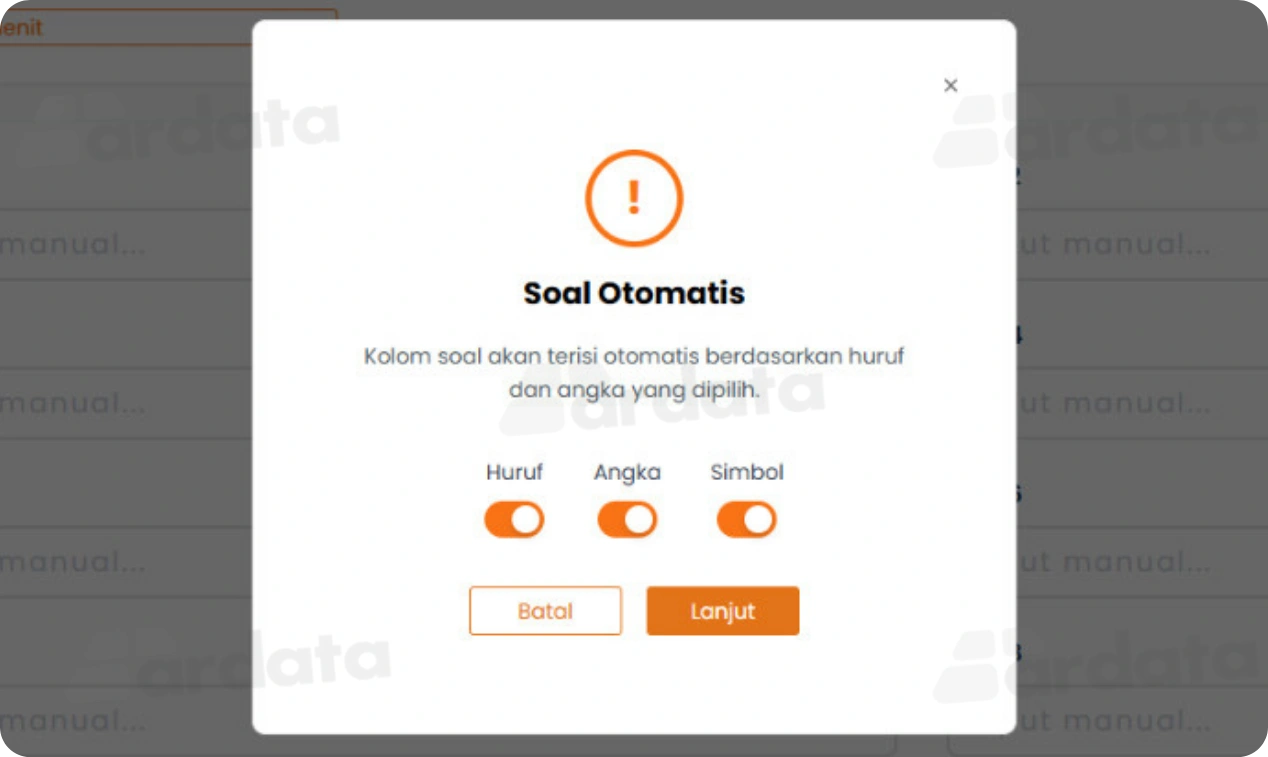Kami menyediakan fitur untuk mengatur jenis soal yang akan digunakan dalam tes, seperti deret angka dengan satu atau lebih angka yang hilang. Fitur ini memungkinkan variasi soal yang dapat disesuaikan dengan kebutuhan pembelajaran dan memastikan bahwa tes tetap menarik dan menantang bagi peserta didik.